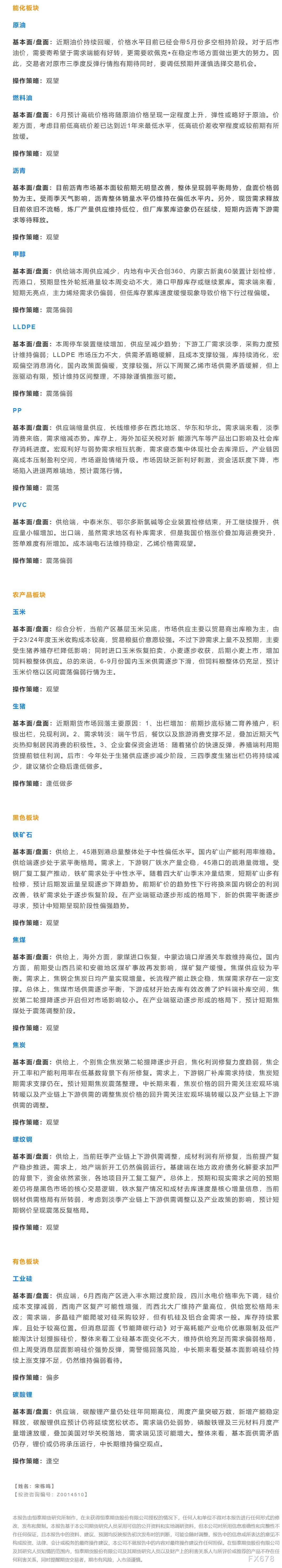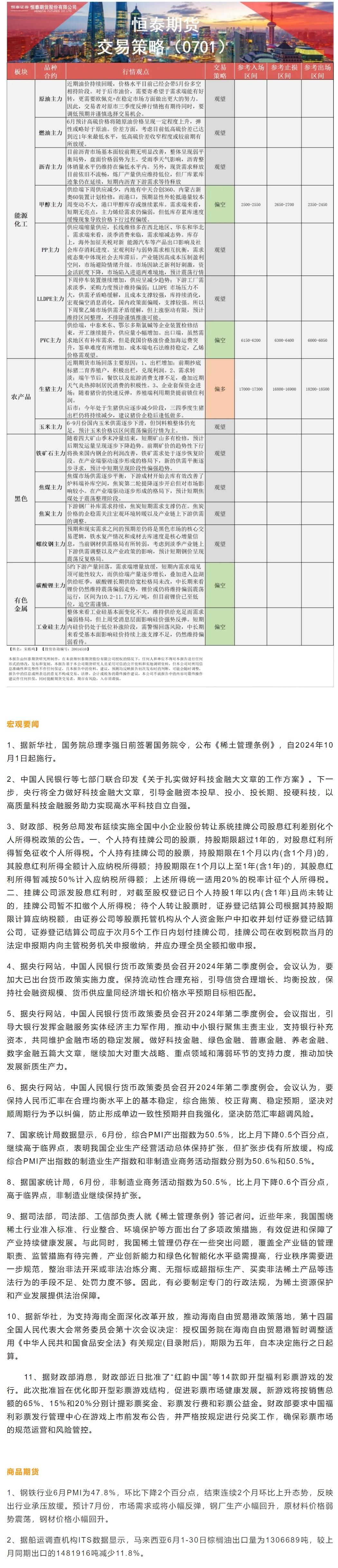 以下是恒泰期货今日早间交易策略,覆盖品种有:宏观分析、原油燃料油等能源化工、玉米生猪等农产品、黑色系如铁矿石焦煤焦炭螺纹钢、有色系如工业硅碳酸锂等。
