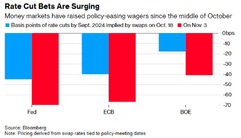债券投资者和利率交易员正越来越多地押注全球主要央行的降息将在夏季之前开始,这挑战了政策制定者在可预见的未来将维持利率“更高更久”的说法。
