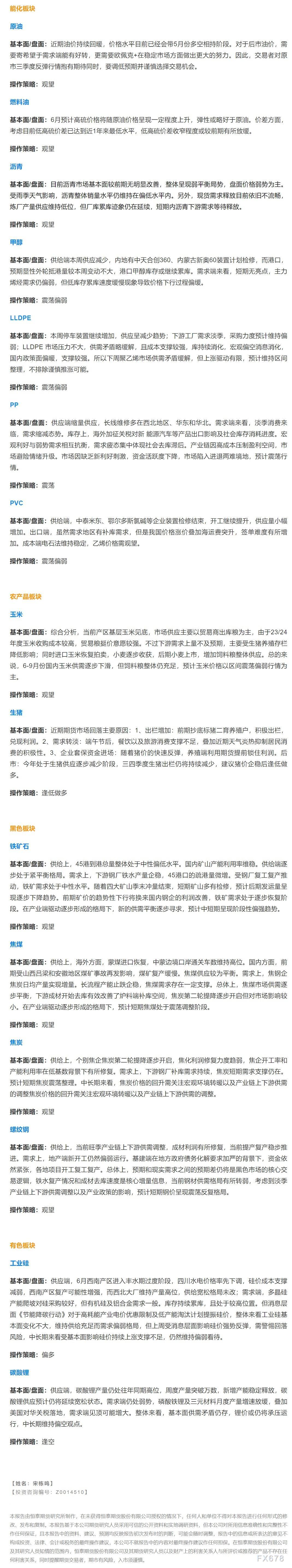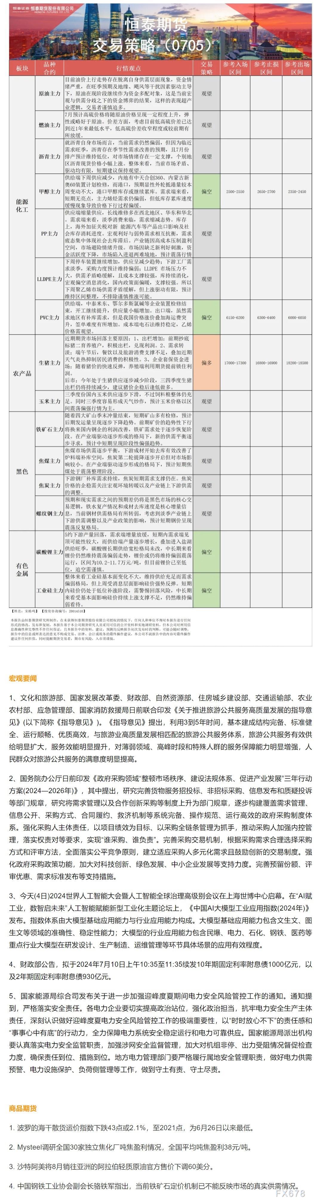 以下是恒泰期货今日早间交易策略,覆盖品种有:宏观分析、原油燃料油等能源化工、玉米生猪等农产品、黑色系如铁矿石焦煤焦炭螺纹钢、有色系如工业硅碳酸锂等。
