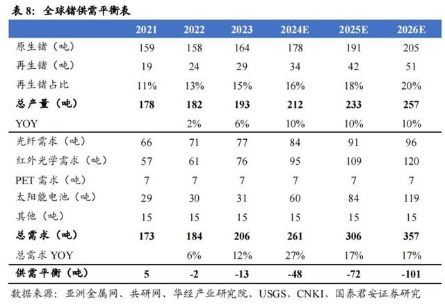 据国泰君安证券预测,全球星链计划将为锗衬底太阳能电池创造了广阔的需求空间,仅考虑美国“Starlink星链”与中国“GW星链”、“G60星链”计划,预计2024-2026年三者合计对光伏锗需求增量为29/44/66吨,预计到2026年该领域总需求将超过光纤领域为119吨,所有领域需求总缺口将达到101吨。