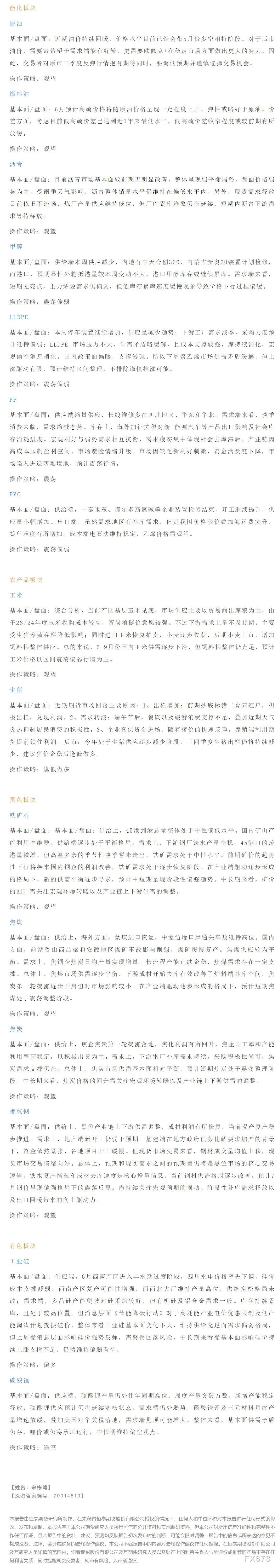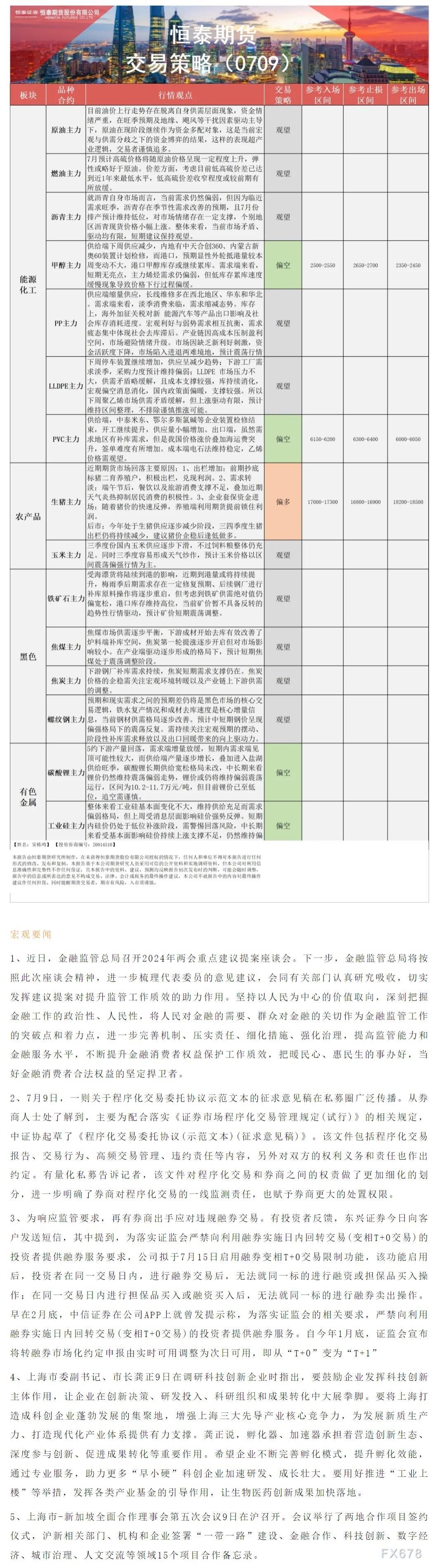 以下是恒泰期货今日早间交易策略,覆盖品种有:宏观分析、原油燃料油等能源化工、玉米生猪等农产品、黑色系如铁矿石焦煤焦炭螺纹钢、有色系如工业硅碳酸锂等。