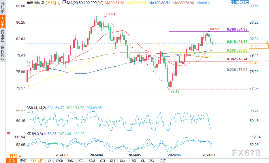 周二(7月9日)欧盘时段,WTI原油盘中走跌,报81.96美元每桶,跌幅0.45%。